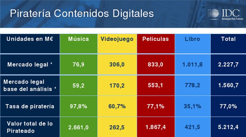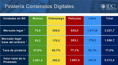 La Coalición de Creadores e Industrias de Contenidos ha presentado (11/03/2010) la segunda oleada del Observatorio de piratería y Hábitos de consumo de Contenidos Digitales. El estudio ha sido elaborado por la consultora IDC y se basa en una encuesta sobre 6.040 usuarios españoles o residentes en España de entre 16 y 55 años.